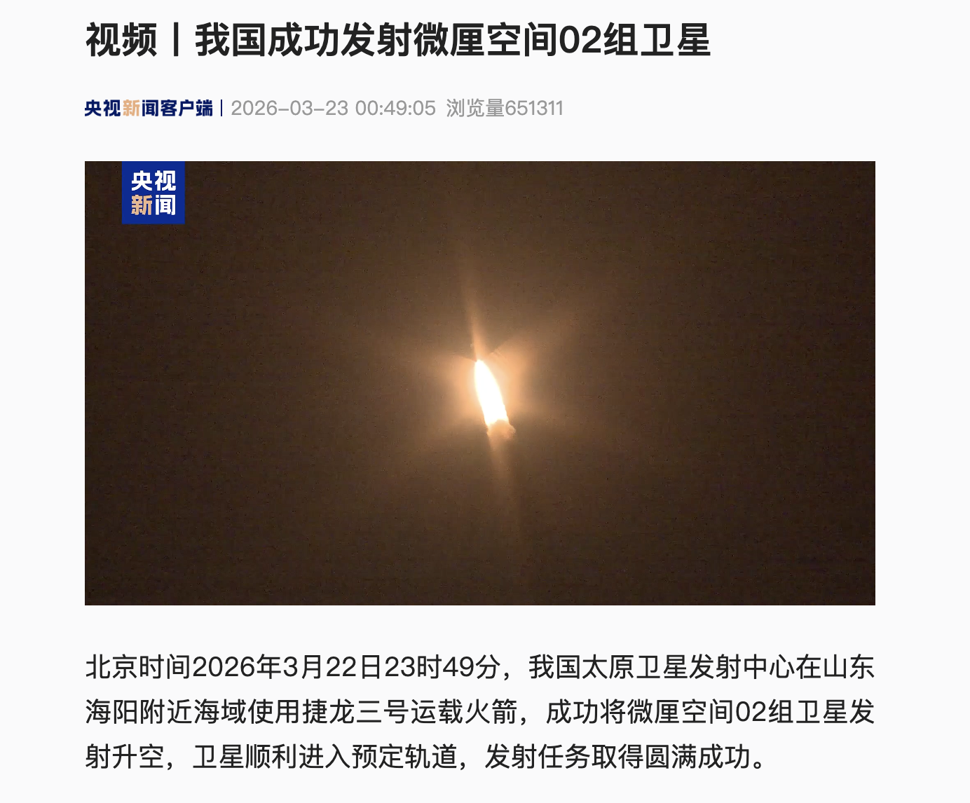 IT之家 3 月 23 日消息,据央视新闻,3 月 22 日 23 时 49 分,我国太原卫星发射中心在山东海阳附近海域使用捷龙三号运载火箭,成功将微厘空间 02 组卫星发射升空,卫星顺利进入预定轨道,发射任务取得圆满成功。此次任务是捷龙三号运载火箭的第 10 次飞行。